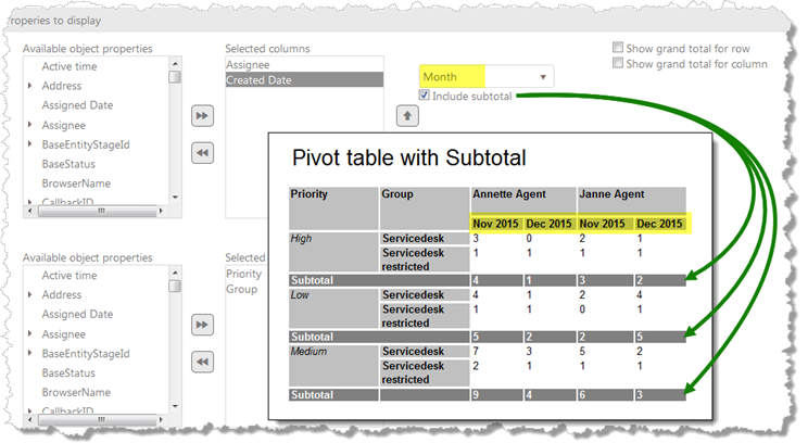 Pivot table is a summary report where all selected properties are rows and columns. The number of objects meeting the property in both row and column is displayed in the cross points. The report answers questions like “How many tickets with different Priorties are assigned to a Handler”