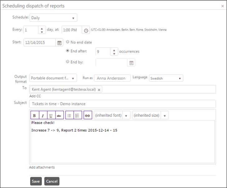 •For daily, weekly and monthly schedule you have to select a start date for the schedule. End date could be selected by checking one of three different alternative checkboxes. No end date means that the scheduling continues until it is manually stopped. If the schedule should be time-limited you can select a date to end the scheduling or define the number of occurrences before ending the scheduling. NB: The number of occurrences means the overall total number, e g if this report has been generated 3 times in the past and you want to execute it 3 more times, you have to set the value to 6.