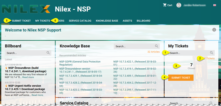 If you want to submit new ticket click on SUBMIT TICKET button (4) or go to Submit Ticket page (5).