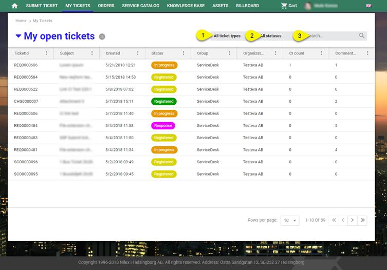 •My open tickets: This list is shown as default when you enter My Tickets initially. The list contains open tickets where logged in user is defined as Requester.