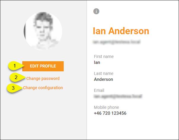 The user profile form also contain a feature to Change Password (2) and Change configuration (3).