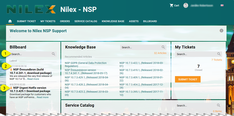The Home page contains search box and latest announcements. When you enter a search keyword in the search box (1), NSP search the announcements for the entered keyword and display the result on the Billboard page. System searches for the keyword in both title and content of the Announcements. Search function has autocomplete feature, you get search result when you start typing keyword.