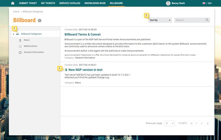 •Left Panel – Panel contains a lists of Billboard Categories (1). When you select a Category, the list is filtered to show only announcements belonging to the selected Category.