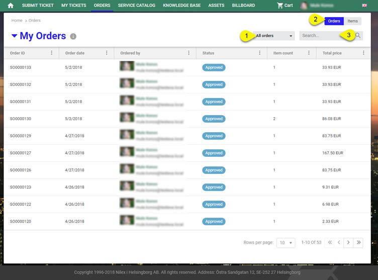 Below figure shows Orders page of Self Service Portal: