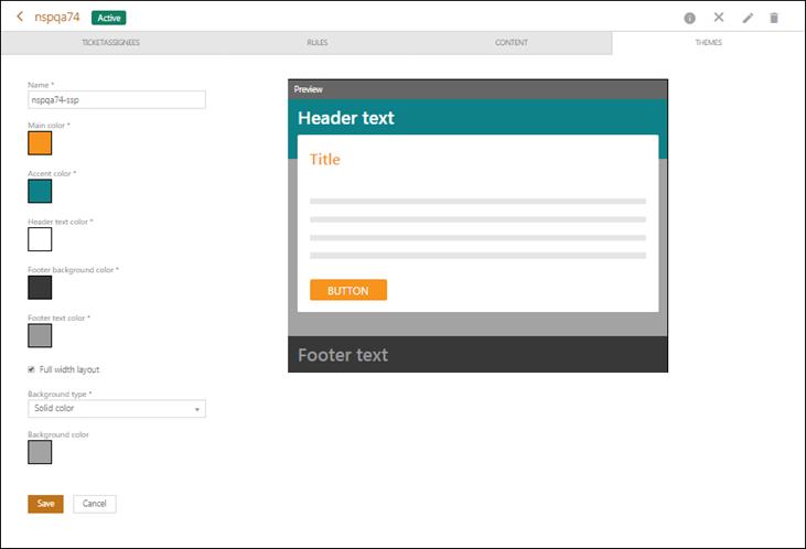 Theme editor form offers possibility of defining theme Name, colors for Main color, Accent Color, Header text color, Footer background color, Footer text color, Full width layout and Background type. Color is selected by clicking respective color box. This opens a popup containing a color picker.