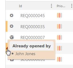 If a ticket in a ticket list is already opened by other Agent this is indicated in the list. A yellow vertical line symbol is shown first (left) in list. When you mouse over the line a popup is shown containing Name of Agent has opened the ticket.