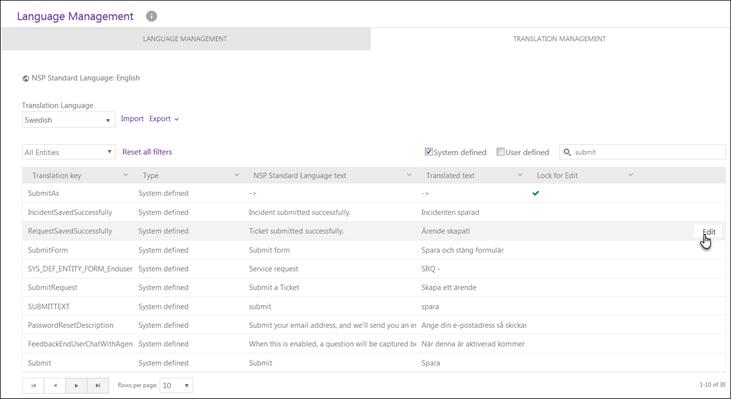 •System Defined. Checkbox to display/not display System Defined tags, the language tags which are part of the NSP installation and common for all NSP systems. This includes e g texts in user interface, error messages, default entities, types and properties. All language tags, both System Defined tags and User Defined tags are displayed as default.