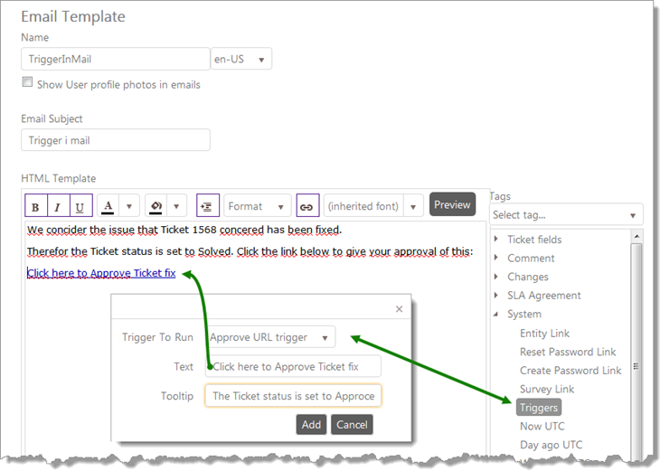 This tag inserts a HTML link into your mail template. When the recipient clicks it, the trigger that you have connected is run. This manipulates the Entity that is the origin of the Notification that has been sent. An example is a links that by clicking it, the recipient accepts a change.