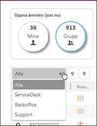 Om Öppna ärenden för Grupp är vald i dashboard så kan man filtrera listan så att bara ärenden som tillhör en viss grupp visas. Filtret finns som en urvalslista längst upp till vänster. Listan innehåller alla grupper som handläggaren ingår i. Man kan välja en specifik grupp eller Alla.