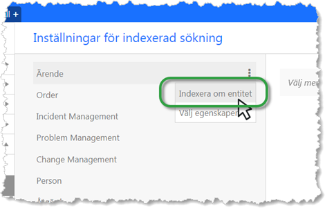 I Agentportalen> Systeminställningar> Inställningar> Indexerad sökning kan administrator bestämma vilka entiteter som skall sökas och i vilka egenskaper. När detta är gjort måste den första indexeringen göras. Det görs genom att för varje aktuell entitet, välja menyalternativet Indexera om entitet.