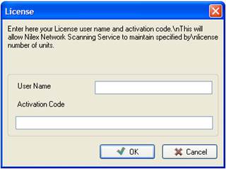 Om NNS tjänsten inte startats än, visas en fråga om start. Annars visas en dialog för att fylla i licensnyckel. Fyll i licensinformation som ni har fått from Nilex.