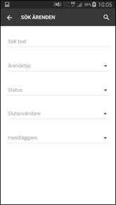Klicka Sök ärenden i Ärenden för att öppna söksidan. Sökning på text görs i fältet Ämne i ärenden. Skriv in text som sökning skall göras på i Sök text, och/eller lägg till ytterligare kriterier (filter) på sökningen. Sökningen kan filtreras på följande egenskaper: •Ärendetyp (klicka på raden, välj en typ i listan). •Status (klicka på raden, välj en status i listan). •Slutanvändare (klicka på raden, börja skriv in namnet på slutanvändaren, man får då upp en lista med namn som uppfyller sökningen, välj en i listan). •Handläggare (välj en Grupp eller enskild Handläggare i listan). |