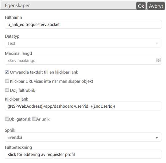 Länk till slutanvändarens användarprofil: {{NSPWebAddress}}/app/dashboard/user?id={{EndUserId}}