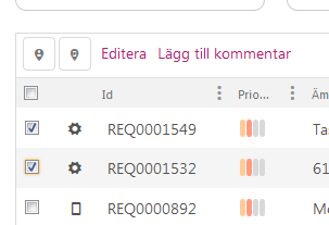 I ärendelistorna i Dashboard och vyer har en kolumn med kryssrutor införts längst till vänster på varje rad. Om en eller flera av kryssrutorna är markerade visas två länkar ovanför listan, Editera och Lägg till kommentar. Editera öppnar ett formulär där man kan editera ärendeegenskaper och spara nya värden i alla de markerade ärendena. Lägg till kommentar öppnar på motsvarande sätt ett formulär där man kan skriva en kommentar och lägga till denna i alla markerade ärenden.