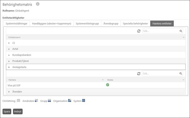 På fliken Hantera entiteter finns inställningar där man kan anpassa Selfserviceportalen, bestämma vilka funktioner som skall vara tillgängliga för användare. Man kan sätta behörighet för roll att få tillgång till Mina ärenden, Skapa ärende, Kunskapsbanken, Produkter & Tjänster och Anslagstavla.