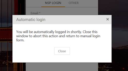 I detta meddelande är det möjligt att avbryta den automatiska inloggningsprocessen och gå till det manuella inloggningsformuläret i NSP (knappen Stäng). Om användaren inte avbryter inom några sekunder sker en automatisk inloggning under förutsättning att det finns en mappning definierad för den aktuella användaren till det externa inloggningssättet.