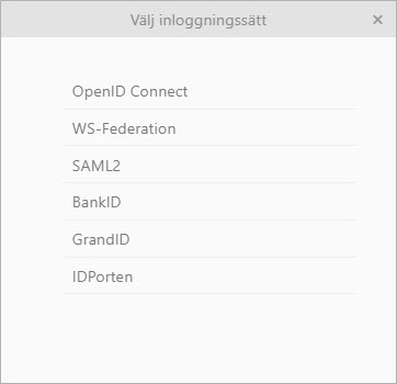 Första steget är att välja typ av inloggning. I nuvarande version kan man välja OpenID Connect, WS-Federation, SAML2, BankID eller GrandID.