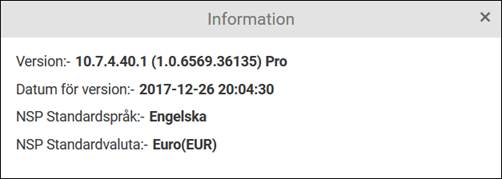 I menyn som visas när man klickar på sitt namn I övre högra hörnet finns alternativet Information. Ett formulär visas som innehåller versionsinformation och systemets grundinställningar.
