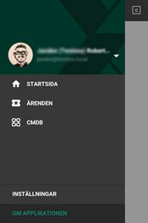 När man klickar på länken till Huvudmeny I den översta delen finns information om den inloggade användaren (Namn och E-postadress). När man klickar i denna del expanderas den och visar två länkar: •Visa profil •Logga ut Den första länken, Visa profil öppnar Användarprofilen för den inloggade användaren. Logga ut går till Inloggningssidan. Ärenden och CMDB har samma funktion som motsvarande knappar på Startsidan. Inställningar öppnar sidan med Användarinställningar. Om Applikationen visar en sida med versionsdata och standardinställningar i NSP (NSP Standardspråk och Standardvaluta). Genom att klicka på ett område utanför menyn (i et gråa fältet till höger) så stängs den. |
