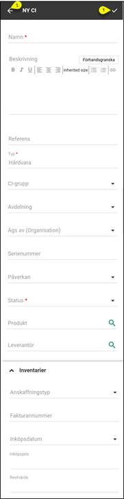 När man väljer Lägg till CI på CMDB startsida visas först en popup där man skall välja CI-typ. När man valt CI-typ öppnas formulär som hör till den valda typen. Exempel för typen Inventarier visas i bilden. Formuläret är uppdelat i olika sektioner baserat