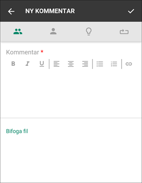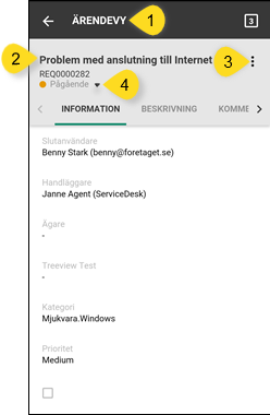 Meny för övriga funktioner o Ändra visning: Öppnar en popup där man kan välja om kommentaren skall vara Publik eller Intern. o Ändra typ: Öppnar en popup där man kan välja Vanlig, Lösning eller Workaround. o Ladda ner bilagor: Visas bara för kommentarer som har bifogade filer. Filerna laddas ner till enheten. |