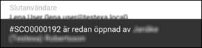 Om ärendet man öppnar redan är öppnat av någon annan Handläggare (i NSP Mobil eller i NSP Webb) så visas ett meddelande nederst på sidan med information om vem som har ärendet öppet.