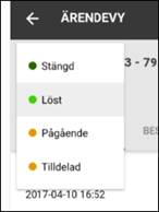 För att ändra ärendets Status, klicka pilsymbolen till höger om statusfältet (4). Välj ny status i urvalsmenyn som visas (menyn innehåller de statusar som går att välja) Ärendet sparas med ny status direkt när man klickar en rad i menyn: