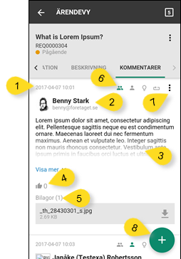 För varje kommentar visas: 1. Datum och tid när kommentaren skapades. 2. Namn, E-postadress och profilbild för användaren som skapade kommentaren. 3. Kommentarstexten. 4. Antal användare som markerat kommentaren som Gillar/Användningsbar. 5. Lista med bifogade filer till kommentaren. 6. Hur kommentaren visas (Publik eller Intern) och typ av kommentar (Lösning eller Workaround).