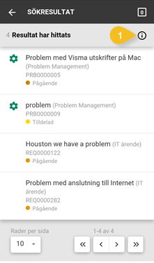 Överst visas antal ärenden som hittats för de aktuella sökkriterierna. Man kan se med vilka sökkriterier som sökresultatet har skapats genom att klicka Info (1) i övre högra hörnet. Klicka ett område utanför menyn som visas för att stänga den. Funktioner för sidbläddring finns under listan på samma sätt som för andra listor. Man kan välja att visa 5, 10, 20 eller 50 ärenden per sida. Om sökresultatet innehåller fler ärenden än valt antal så visas endast en sida initialt. |