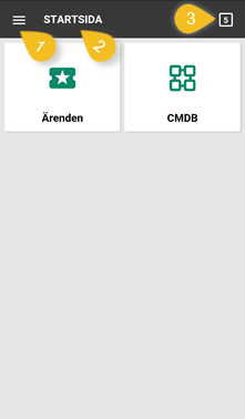 Startsidan visas efter en korrekt inloggning. Detta är förstasidan av handläggarens gränssnitt. Härifrån når man de olika funktionerna i applikationen. På Startsidan kan man välja Ärenden och CMDB: Ärenden: Klicka här för att komma till ärendehanteringens startsida. CMDB: Gå till startsidan för CMDB. På Startsidan och på alla andra sidor, förutom när ett formulär visas, så innehåller rubrikdelen Huvudmeny (1), rubrik för den aktuella sidan (2) och fliklänkar (3) som visar antalet öppna flikar. Fliklänkar Man kan alltid klicka på fliklänken i övre högra hörnet för att visa en lista med öppna flikar. Antalet flikar som är öppna för tillfället visas som en siffra i rutan. Klicka en rad i listan för gå direkt till den fliken. Stäng en flik genom att klicka X. I Användarprofilen definierar man hur många flikar som maximaltskall kunna vara öppna samtidigt. |