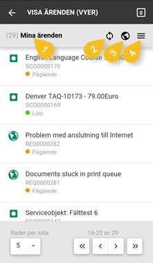 Funktioner för sidbläddring finns under listan på samma sätt som för andra listor. Man kan välja att visa 5, 10, 20 eller 50 ärenden per sida. Om vyn innehåller fler ärenden än valt antal så visas endast en sida initialt.