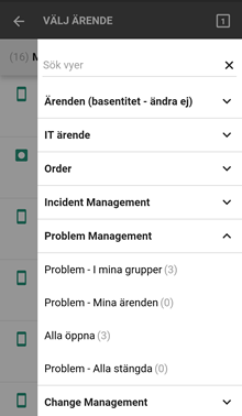 Vilka vyer som kan välja här kan variera, tillgängliga vyer definieras av systemadministratör i webbgränssnittet. Vyerna är uppdelade på Ärendetyp, man kan expandera/minimera listan för varje typ genom att klicka pilsymbolen till höger. Notera att här kan man även öppna Åtgärdsvyer för att visa listor med åtgärder. Klicka en vy, då stängs sidopanelen och den valda vyn visas.