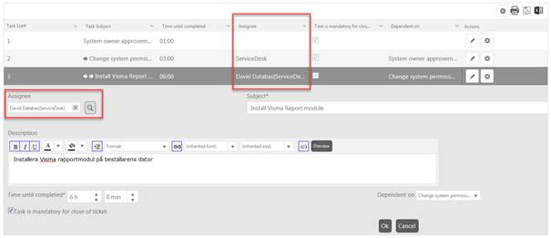 Pre-defined assignees can be set in Task Template, see above. When you add the template to a ticket the pre-defined values is default selected. If pre-defined values shall be used you just click Save and all task will be added. If any task has no pre-defined assignee set, task will be assigned to Group the master ticket assignee belongs.