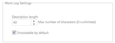 Description length: Define the maximum no of characters in a Work Log Description. This setting can be used e g if work logs should be exported to external system having a limitation in text length for description. Value=0 means that maximum no of characters is unlimited. When work log is added user get a message when trying to input a description that exceed the maximum no of characters. User must remove characters to be able to save the work log.