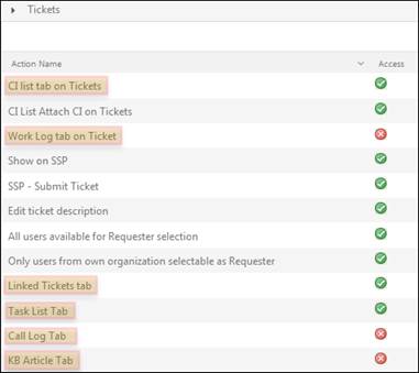 For a role you can enable/disable access to different tabs in ticket form. Select Entity Actions tab, Tickets section. Here you can manage access to the tabs in ticket form: