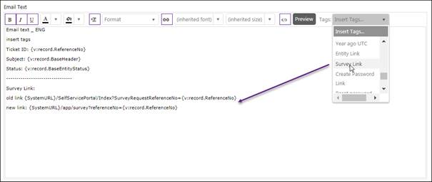 In Survey Settings, remove the old link and select tag Survey link to replace it: