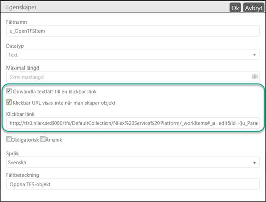 Ny fälttyp i entitetshanteraren, Klickbart fält. Med detta kan man skapa ett fält för att anropa en URL/URI från entiteten. Man kan definiera textfält (Datatyp=Text) som klickbara genom att aktivera kryssrutan Omvandla textfält till en klickbar länk.