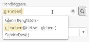 Förbättring i ärendeformulär, fält för Handläggare. Systemet söker också på handläggarens e-postadress för att skapa en lista för auto-complete (tidigare sökte man bara på namn).
