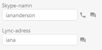 Nya ikoner i Användarprofil för fälten Skype och Lync. Vid sidan om fälten finns ikoner för att ringa upp eller starta en chattkonversation.