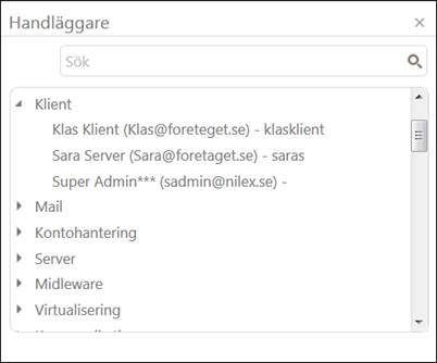 I inställningarna i Namnkonfiguration kan använda taggar för Förnamn, Efternamn, E-postadress och Windows användarnamn samt lägga till text (t ex blanktecken och parenteser) för att konfigurera formatet på handläggarnamn.