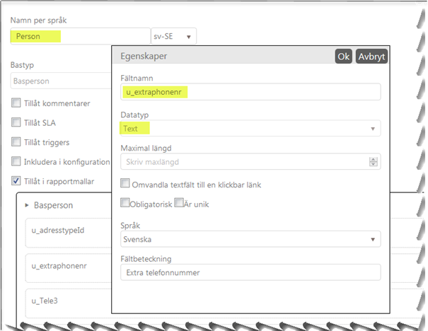 1. Lägg till egenskap på entiteten Person. Välj typ "Text"