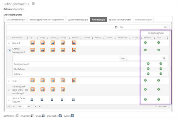 Behörighetsmatris, fliken Ärendegrupp med alla fältbehörigheter aktiverade