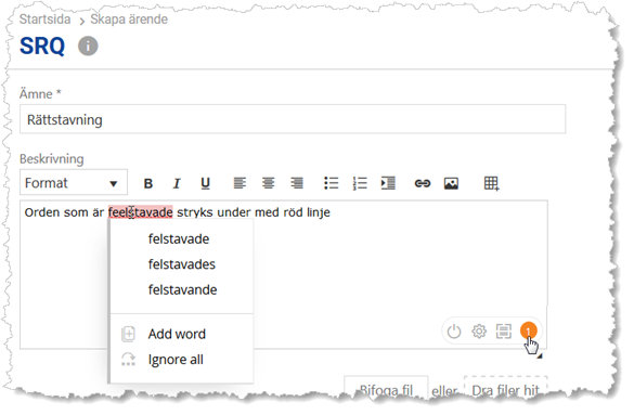Man kan aktivera ett insticksprogram för rättstavning som kontrollerar vad du skriver i SSP och i Agentportalen. Insticksprogrammet fungerar i fält av typen Text och Text area. I textareafälten syns en orange ikon i nedre vänstra hörnet och där kan man komma åt funktioner och inställningar.