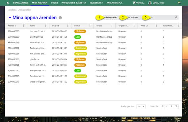 Med sökfunktionen (3) kan man söka efter ärenden i listan. Systemet söker efter sökordet i Id, Ämne, Ärendetyp, Status och Handläggare.