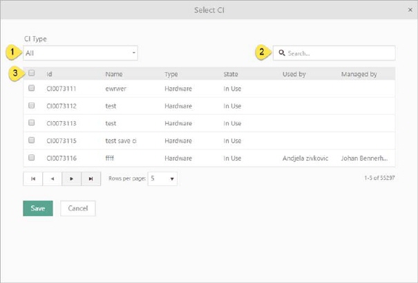 CIs can be searched by name (2) and/or be filtered by CI Type (1). After choosing CI Type table is filtered due to selected type (and it´s subtype).
