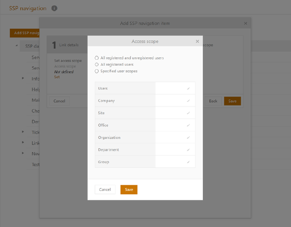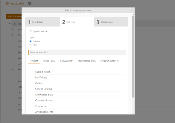 Clicking Add SSP Navigation item opens pop-up window with 3 steps: 1) Link details, 2) Link type and 3) Access scope.