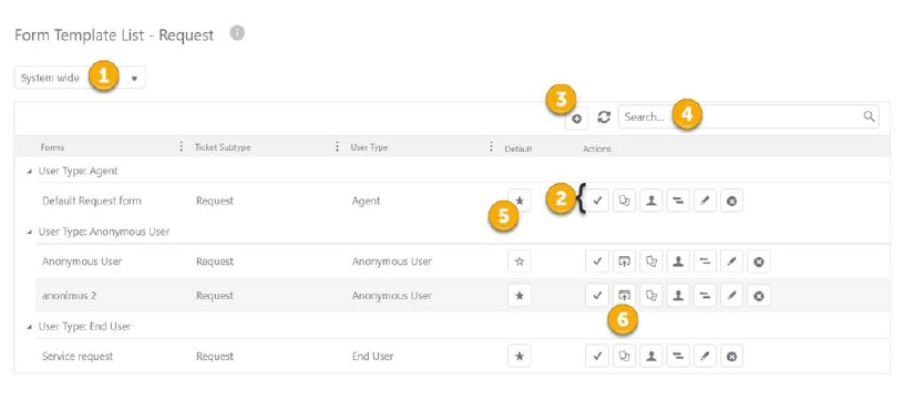 You can create, edit, clone, activate or deactivate, change ticket type, and delete entity forms and you can also define the scope of a form and make the form as a default. The form is only displayed to the users covered under the defined scope.