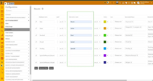 An alternative name can also be set for the Entity Statuses in Global Configuration/System tab/ Entity Status.