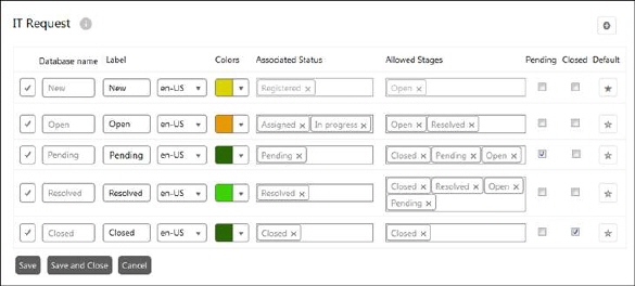 This form provides an interface to add, edit and activate or deactivate the stages for an entity. Stages can be New, Open, Resolved, Closed etc. You can define the (database)name, label for different languages, and color code as you want for different stages and associated statuses for each stage. The database name can never be changed once the stages has been saved. If you create your own stages, the database name will get the prefix “SysUsrDefEntityname_”. However, you can add an alternative name, which will be displayed to end-users on SSP.