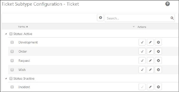 The Ticket Subtype list contains already existing subtypes. The list contains active types followed by inactive ones. Each item in this list has Action buttons:
